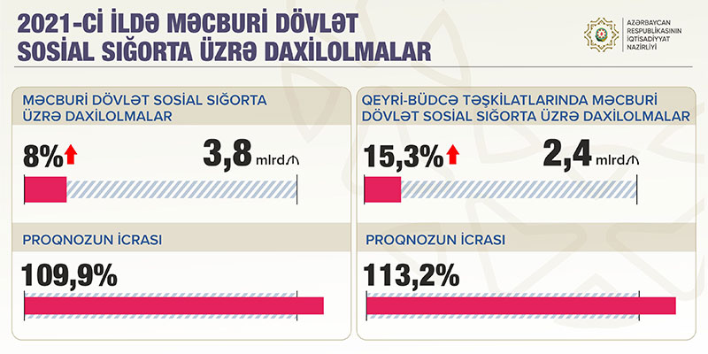Nazir paylaşdığı başqa bir məlumatda bildirib ki, 2021-ci ildə məcburi dövlət sosial sığorta üzrə daxilolmalar 8% artaraq 3,8 mmilyard manatı keçib və proqnoz 109,9% səviyyəsində icra olunub. Qeyri-büdcə təşkilatlarında da müsbət dinamika qeydə alınıb. Bu sahədən məcburi dövlət sosial sığorta üzrə daxilolmalar 15,3% artaraq 2,4 milyard manatı ötüb və proqnoz 113,2% yerinə yetirilib.