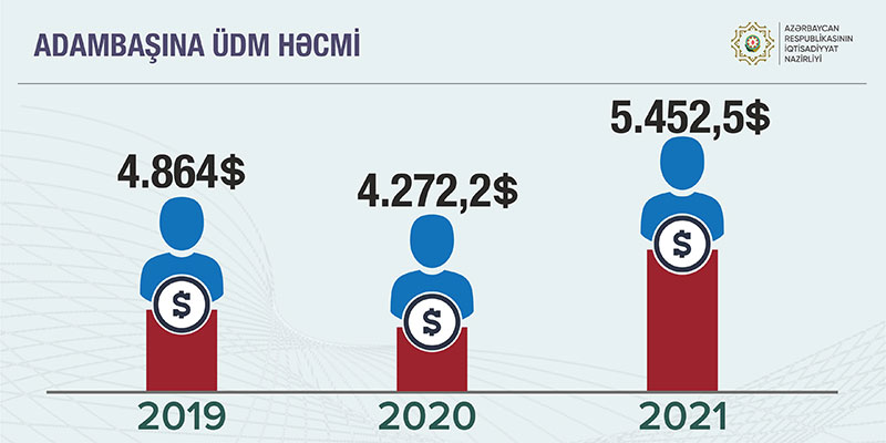 İqtisadiyyat naziri Mikayıl Cabbarov Tvitter səhifəsində yazıb ki, ötən il ölkəmizdə adambaşına ümumi daxili məhsul (ÜDM) 5 min 452 dolları üstələyib ki, bu da 2019-cu ilin göstəricisindən 590 dollaradək çoxdur.