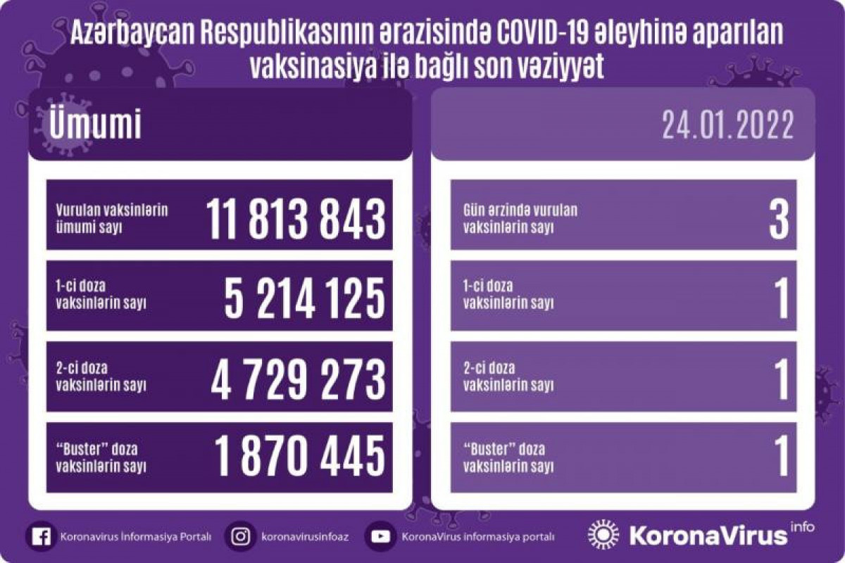 Azərbaycanda son sutkada koronavirus (COVID-19) əleyhinə 3 vaksin vurulub. Bir gündə birinci mərhələ üzrə vaksinasiya olunanların sayı 1, ikinci mərhələ üzrə vaksinasiya olunanların sayı 1, buster doza üzrə vaksinasiya olunanların sayı isə 1 nəfərdir.