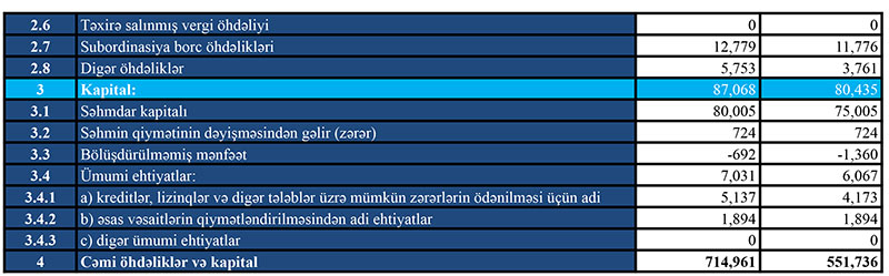 31 dekabr 2021-ci il tarixində 91 milyon 917 min manat manat məcmu kapitala malik olub. Bank 31 dekabr 2020-ci il tarixində 82 milyon 215 min manat cəmi kapitala malik idi.