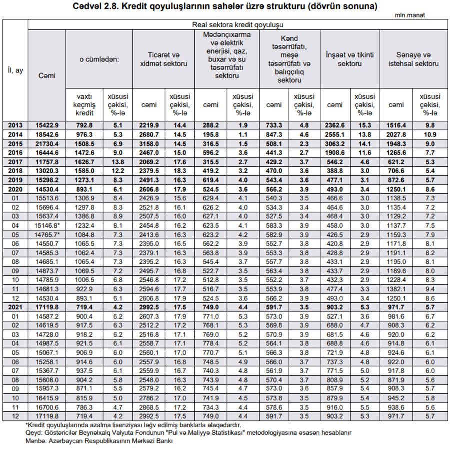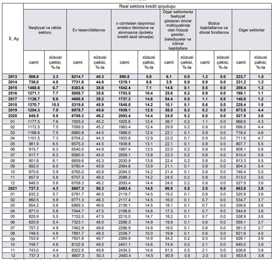 Ev təsərrüfatlarına verilən kreditlərin cəmi kredit qoyuluşlarında xüsusi çəkisi ilk dəfə 50%-i keçib.Aərbaycanda ev təsərrüfatlarına verilən kreditlər (əsasən istehlak kreditləri) 2020-ci illə müqayisədə 2021-ci ildə 1 milyard 898 milyon manat artaraq 8 milyard 607,3 milyon manata çatıb. 2020-ci ilin sonunda ev təsərrüfatlarına verilən kreditlər 6 milyard 709,3 milyon manat təşkil etmişdi.