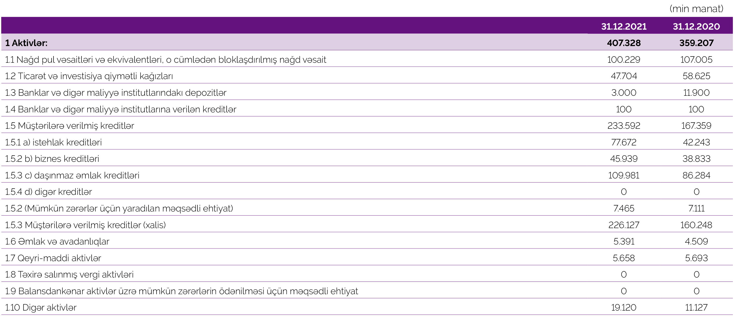 “Azər-Türk Bank”ın cəmi aktivləri 2020-ci illə müqayisədə 2021-ci ildə 13,4% və ya 48 milyon 121 min manat artaraq 407 milyon 328 min manat təşkil edib. Bank 2020-ci ilin sonunda 359 milyon 207 min manat cəmi aktivlərə malik idi.