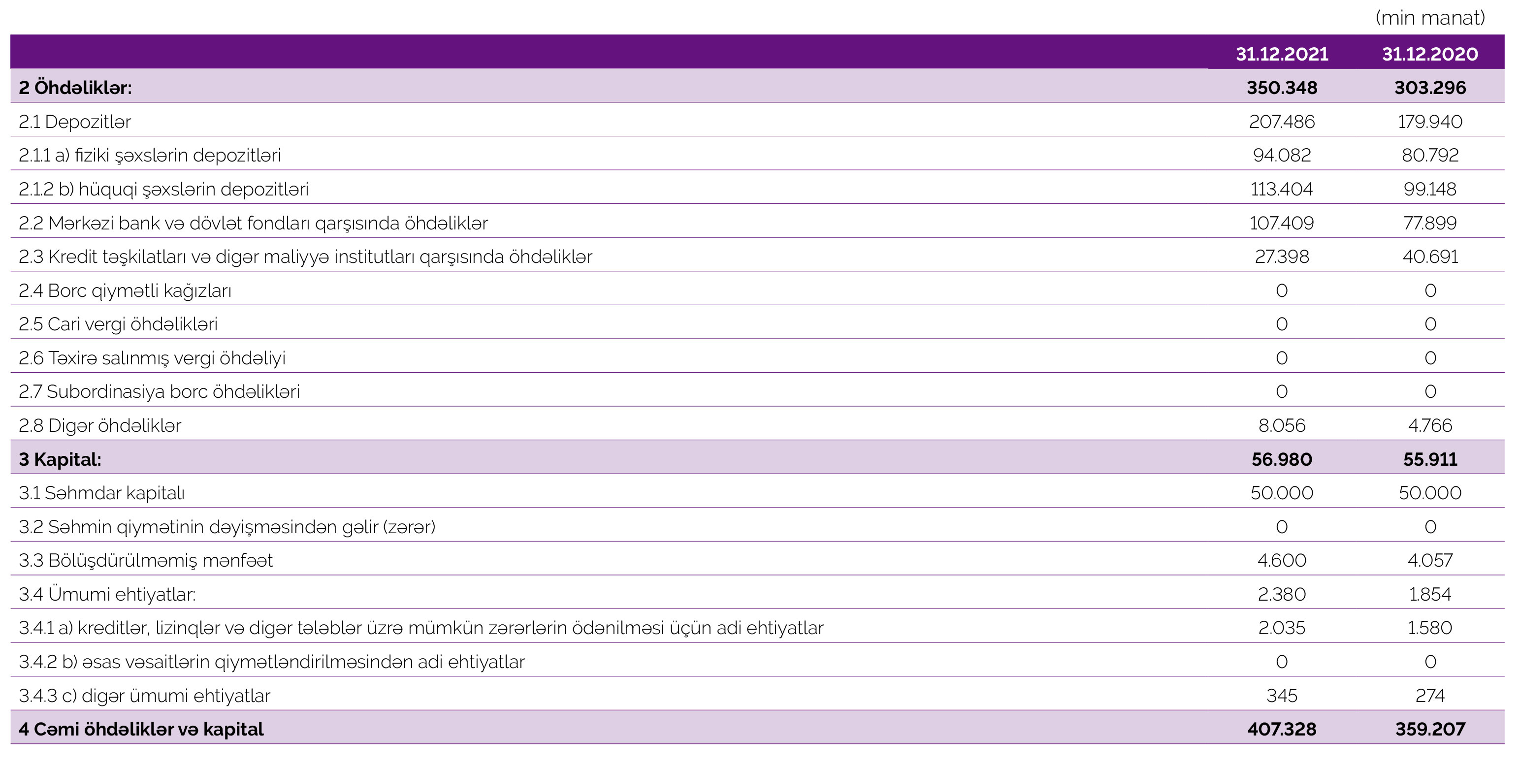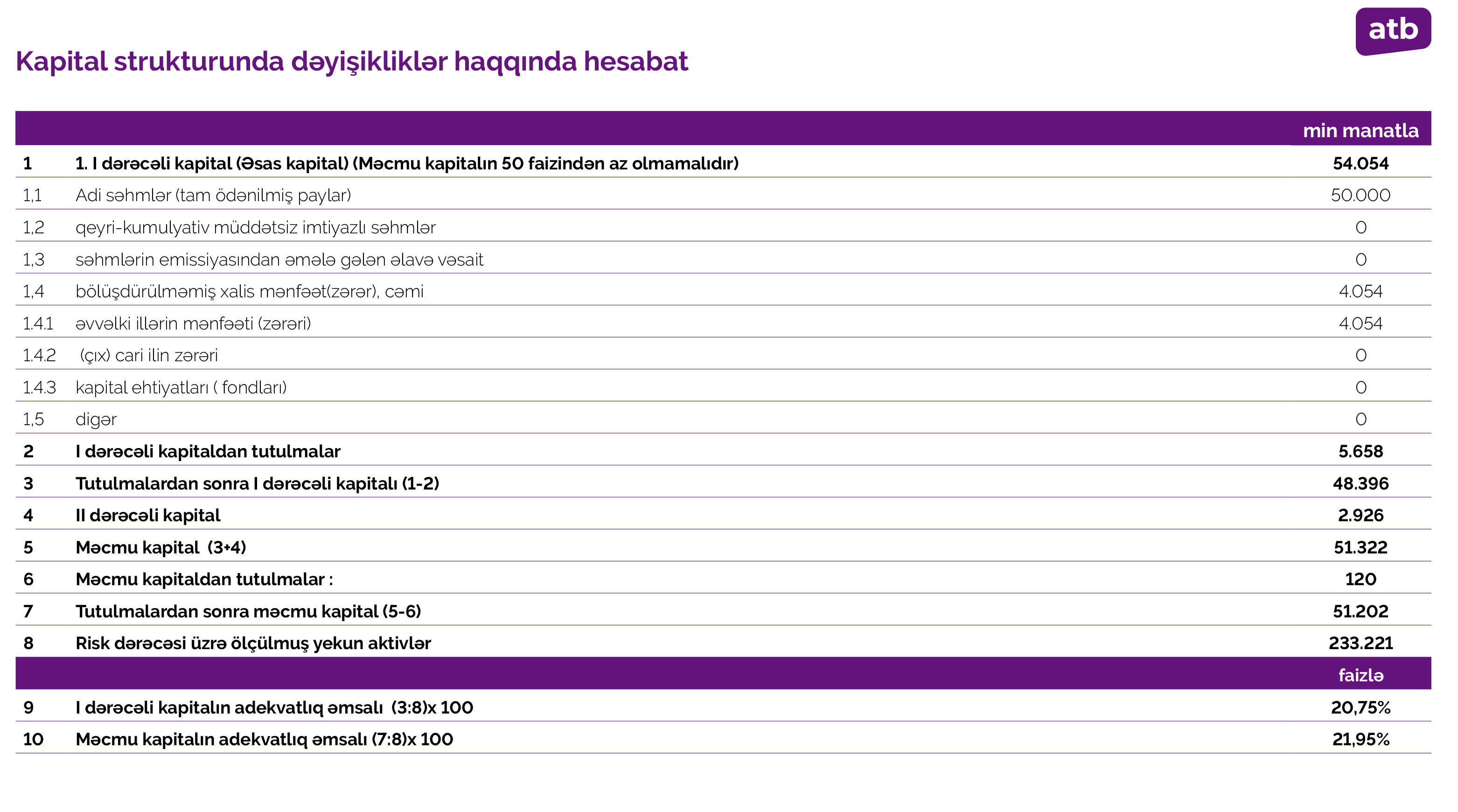 31 dekabr 2021-ci il tarixində “Azər-Türk Bank” 51 milyon 202 min manat məcmu kapitala malik olub. Bank 31 dekabr 2020-ci il tarixində 50 milyon 38 min manat cəmi kapitala malik idi.