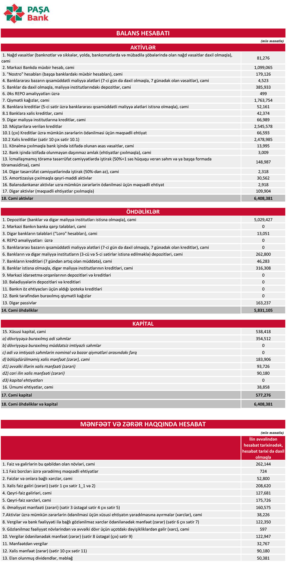 31 dekabr 2021-ci il tarixində "PAŞA Bank" 6 milyard 408 milyon 381 min manat cəmi aktivlərə, o cümlədən 2 milyard 545 milyon 578 min manat kredit portfelinə (müştərilərə verilmiş kreditlər) malik olub. 31 Dekabr 2020-ci il tarixində "PAŞA Bank" 5 milyard 513 milyon 21 min manat cəmi aktivlərə, o cümlədən 2 milyard 95 milyon 34 min manat kredit portfelinə malik idi. Beləliklə, ötən il PAŞA Bankın cəmi aktivləri 895 milyon 350 min manat, o cümlədən kredit portfeli 450 milyon 544 min manat artıb.
