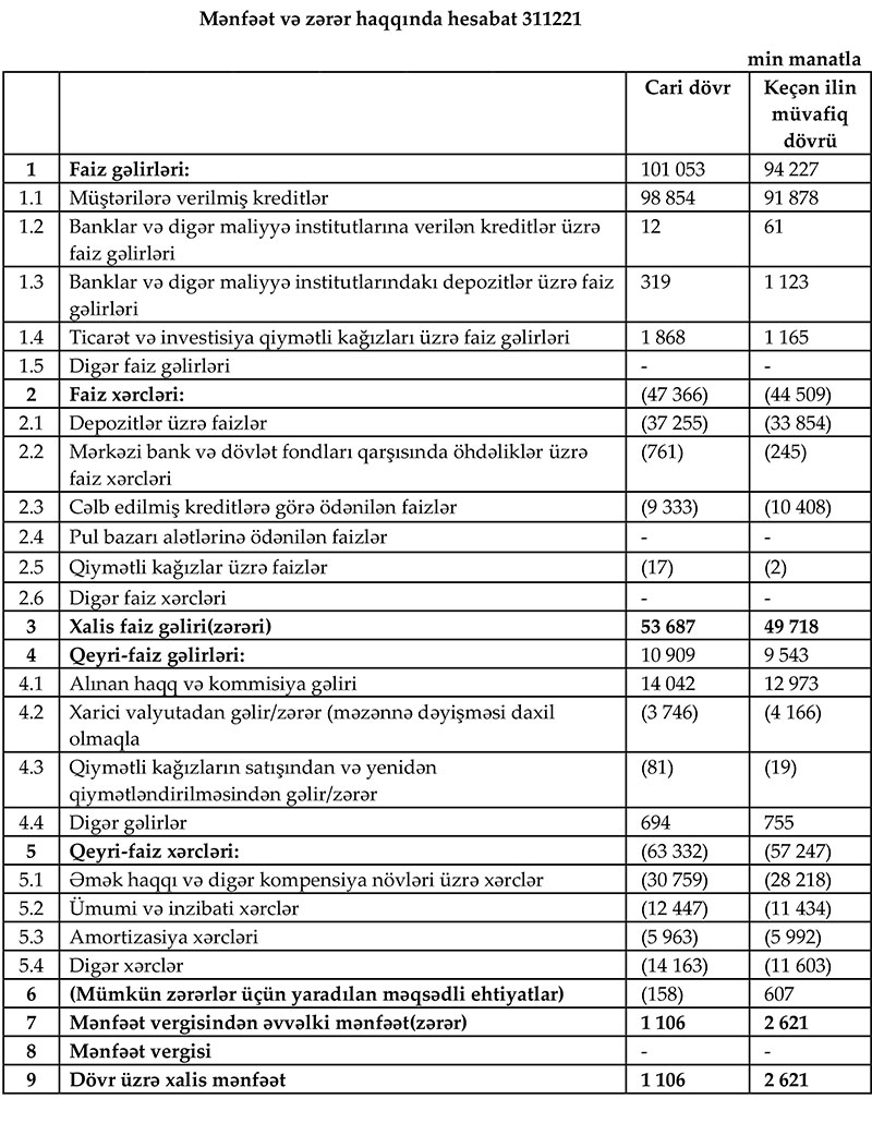 Ötən il xərcləri gəlirlərini üstələdiyində “AccessBank”ın 1 milyon 264 min manat əməliyyat mənfəəti yaranıb (2020-ci ildə 2 milyon 14 min manat). Bank mümkün zərərlər üçün yaradılan məqsədli ehtiyatlara 158 min manat ayırdığından illi 1 milyon 106 min manat xalis mənfəət ilə başa vurub. Qeyd edək ki, 2020-ci ildə ehtiyatdan azad olmuş 607 min manat hesabına Bankın mənfəəti 2 milyon 621 min manata yüksəlmişdi.