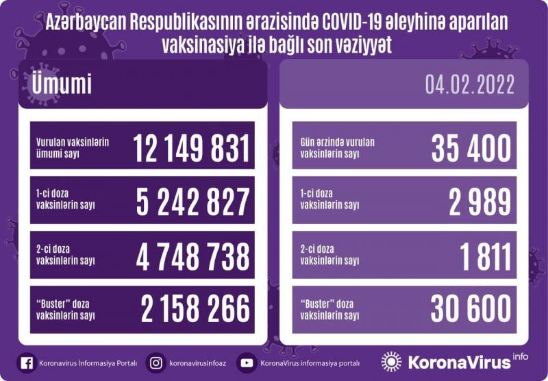 Azərbaycanda son sutkada koronavirus (COVID-19) əleyhinə 35 400 vaksin vurulub. Bir gündə birinci mərhələ üzrə vaksinasiya olunanların sayı 2 989, ikinci mərhələ üzrə vaksinasiya olunanların sayı 1 811, buster doza üzrə vaksinasiya olunanların sayı isə 30 600 nəfərdir.