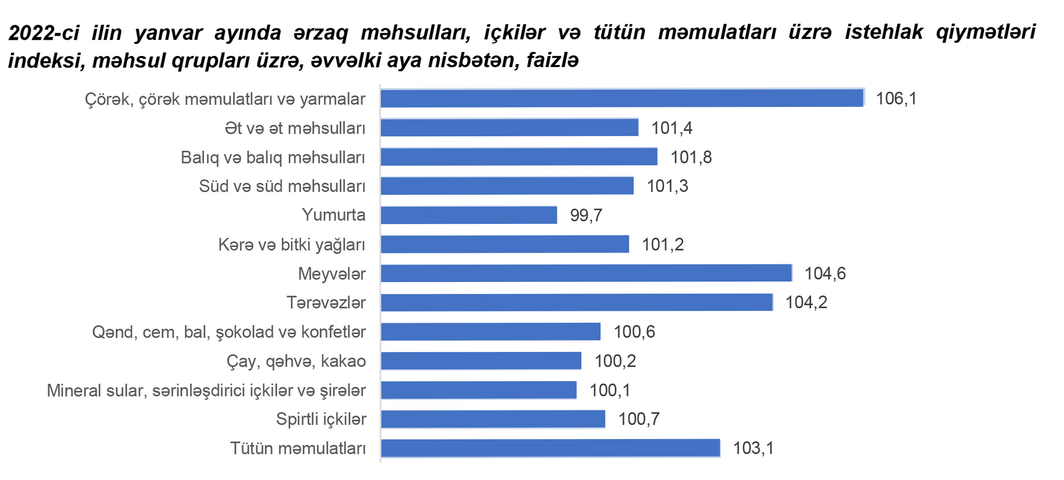 2022-ci ilin yanvar ayında ərzaq məhsulları, içkilər və tütün məmulatları üzrə istehlak qiymətləri indeksi əvvəlki aya nisbətən 2,6 faiz yüksəlib.