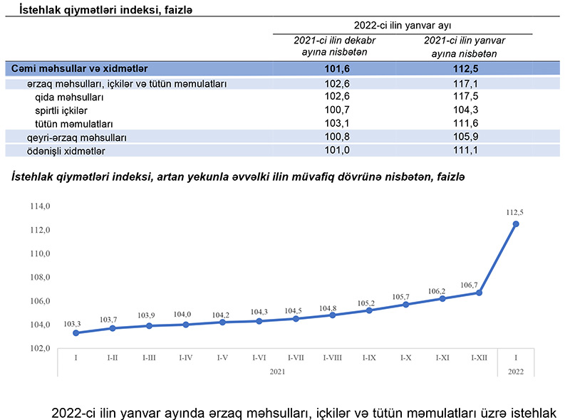 Azərbaycanda illik inflyasiya 13%-ə yaxınlaşıb. Ərzaq inflyasiyası isə 17%-i keçib.2022-ci ilin yanvar ayında istehlak qiymətləri indeksi (inflyaiya göstəricisi) 2021-ci ilin yanvar ayına nisbətən 12,5 faiz, o cümlədən ərzaq məhsulları, içkilər və tütün məmulatları üzrə 17,1 faiz, qeyri-ərzaq məhsulları üzrə 105,9 faiz, əhaliyə göstərilmiş ödənişli xidmətlər üzrə 11,1 faiz artıb.