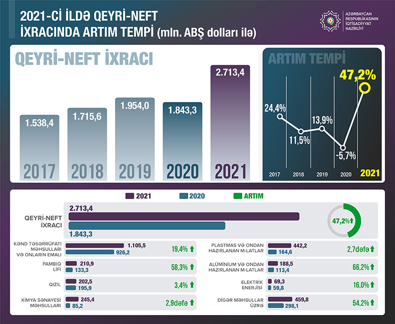 Azərbaycanın iqtisadiyyat naziri Mikayıl Cabbarov bildirib ki, 2021-ci ildə qeyri-neft məhsullarının ixracı əvvəlki ilə nisbətən 47,2% artıb və bu, ən yüksək tarixi göstəricidir.