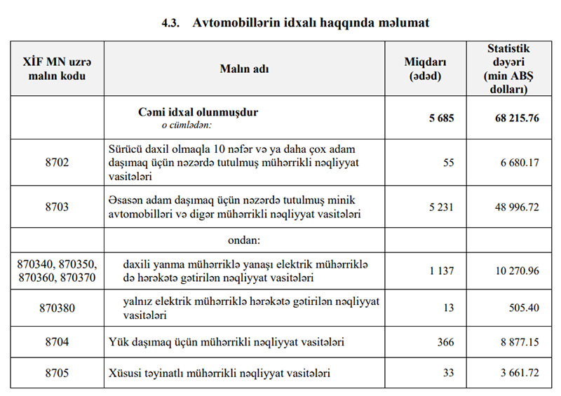 2022-ci ilin Yanvar ayında Azərbaycana 68 milyon 216 min dollar dəyərində 5 min 685 ədəd avtomobil (nəqliyyat vasitəsi) idxal edilib.