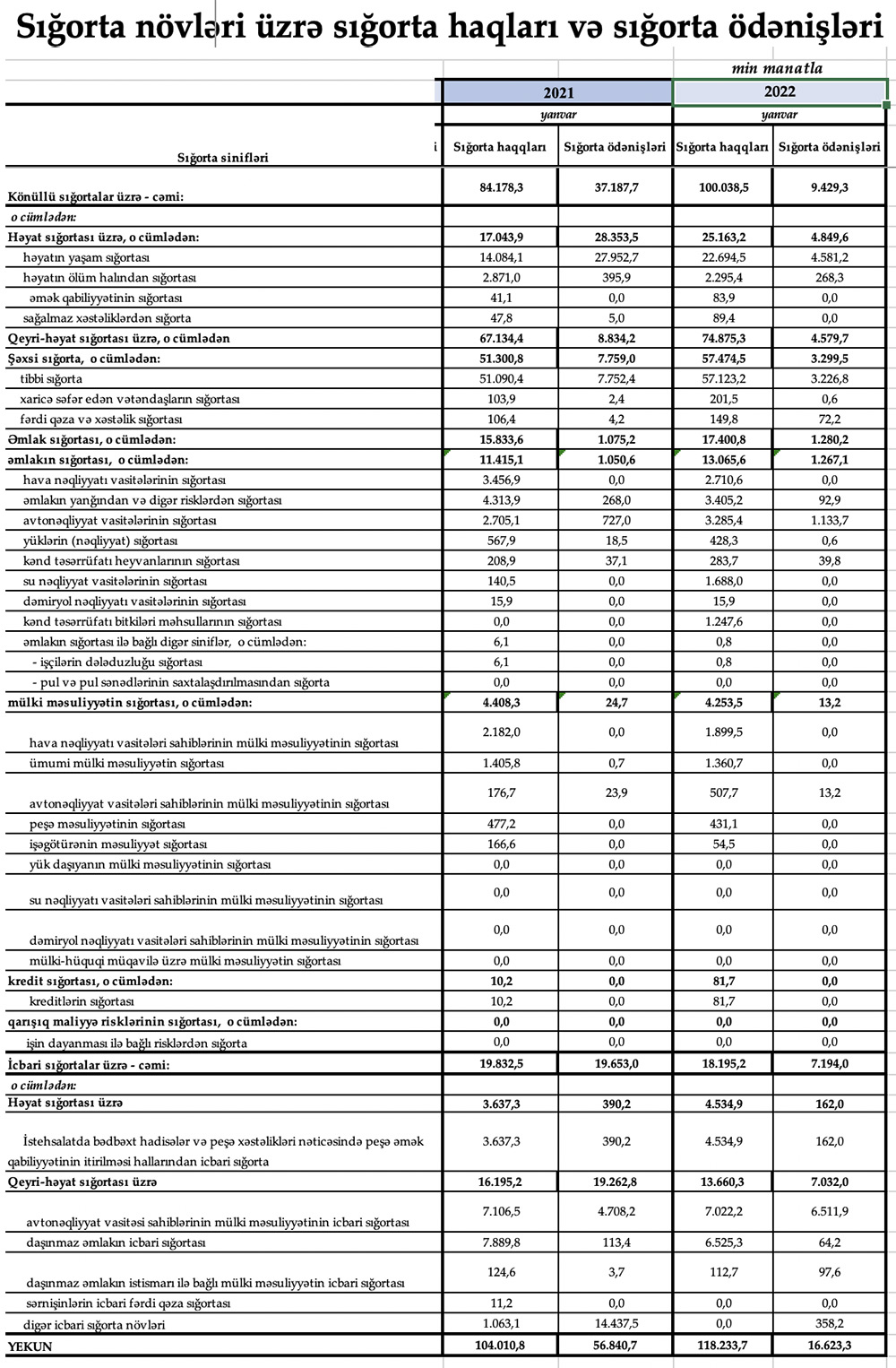 Sığorta şirkətlərinin 2022-ci ilin yanvar ayında hesabladıqları cəmi sığorta haqları2021-ci ilin yanvar ayı ilə müqayisədə 14 milyon 223 min manat və ya 13,7% artaraq 118 milyon 234 min manat təşkil edib. Artım həyatın yaşam, tibbi və əmlak sığortaları üzrə hesablanan sığorta haqlarının artmasından qaynaqlanır. İcbari sığortalar üzrə hesablanan sığorta haqları azalıb.
