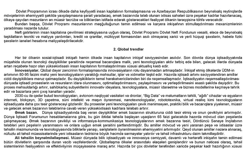 "Marja" xəbər verir ki, sərəncamla “Gənclərin xarici ölkələrin nüfuzlu ali təhsil müəssisələrində təhsil almalarına dair 2022–2026-cı illər üçün Dövlət Proqramı” təsdiq edilib.
