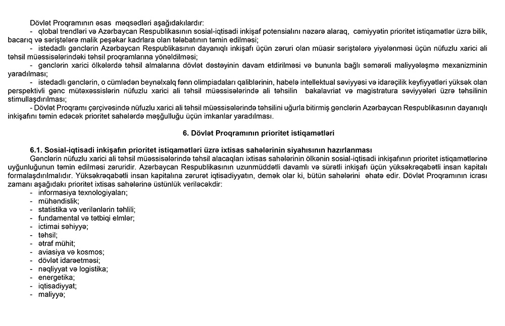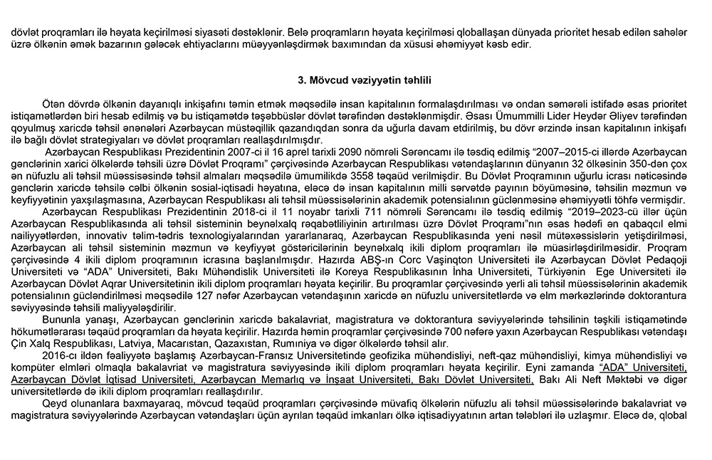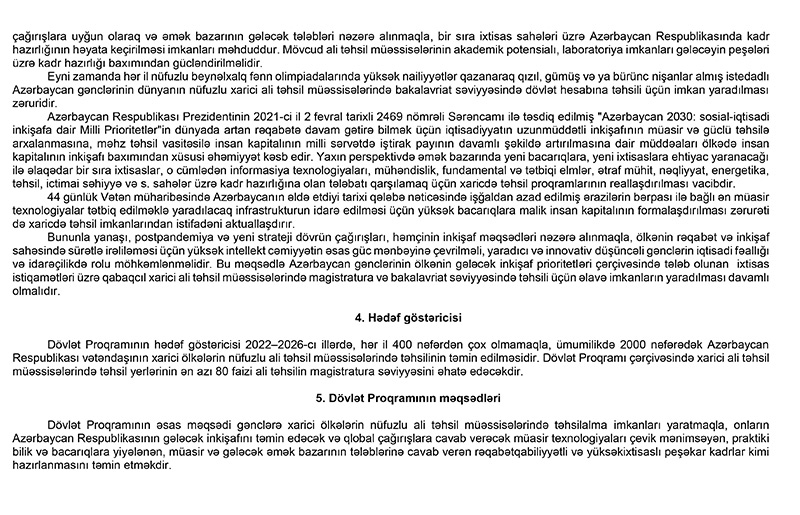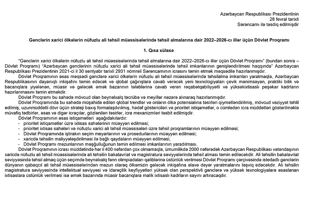Gənclərin xarici ölkələrin nüfuzlu ali məktəblərində təhsil almalarına dair Dövlət Proqramı təsdiq edildiPrezident İlham Əliyev “Gənclərin xarici ölkələrin nüfuzlu ali təhsil müəssisələrində təhsil almalarına dair 2022–2026-cı illər üçün Dövlət Proqramı”nın təsdiq edilməsi haqqında sərəncam imzalayıb.