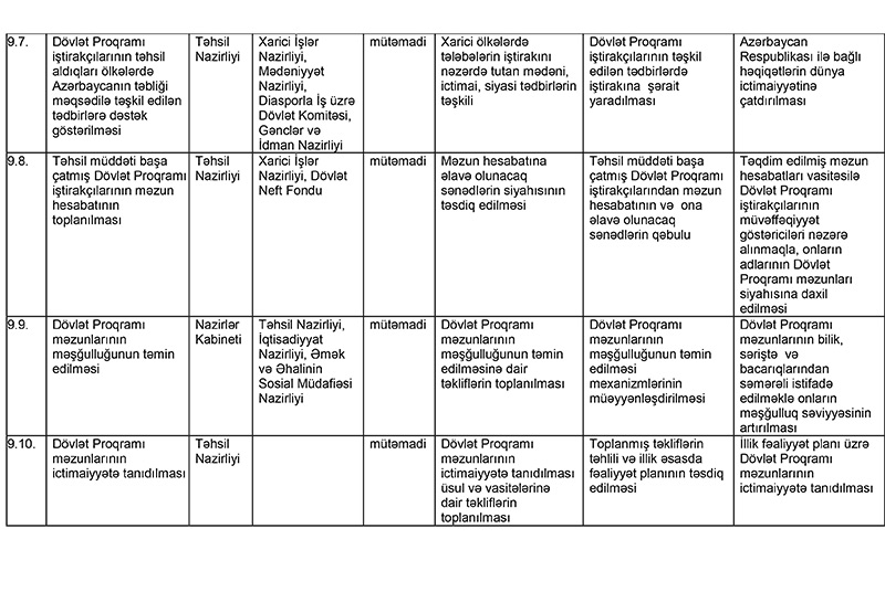 Təhsil Nazirliyi bu Sərəncamın 1-ci hissəsi ilə təsdiq edilmiş Dövlət Proqramında nəzərdə tutulan tədbirlərin həyata keçirilməsini əlaqələndirməli və Dövlət Proqramının icrasının gedişi barədə ildə bir dəfə Azərbaycan Prezidentinə məlumat verməlidir.