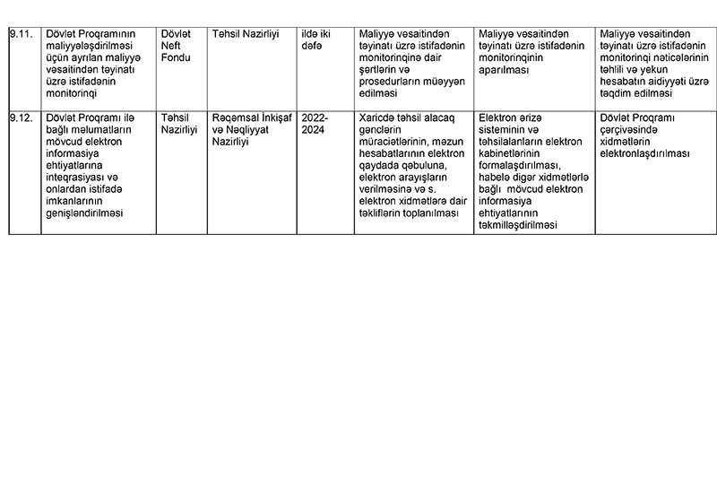 Dövlət Proqramında nəzərdə tutulmuş tədbirlərin icrasının monitorinqini və qiymətləndirilməsini Təhsil Nazirliyinin sifarişi əsasında İqtisadiyyat Nazirliyi həyata keçirəcək.