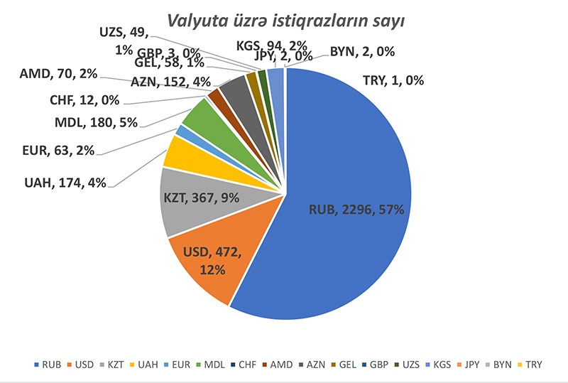 MDB-yə daxil olan ölkələrin ümumi istiqrazlarının həcmi dollar ekvivalentində 735,9 milyard ABŞ dollar, sayca 3995 ədəd olmaqla, müxtəlif valyutalarda buraxılmış istiqrazlardan ibarətdir. Aşağıda bu region üzrə buraxılmış 3995 ədəd iqtiqrazın sayca hansı valyutalar arsında bölünməsi göstərilib. Görmək olur ki, sayca buraxılan istiqrazların 57% Rusiya rublda, 12%-i ABŞ dollarında, 9 faizi Qazaxıstan təngəsində, 4%-i Ukrayna qrivnasında, 4% manatda, 2% avroda və digər valyutalarda olan istiqrazların payına düşür.