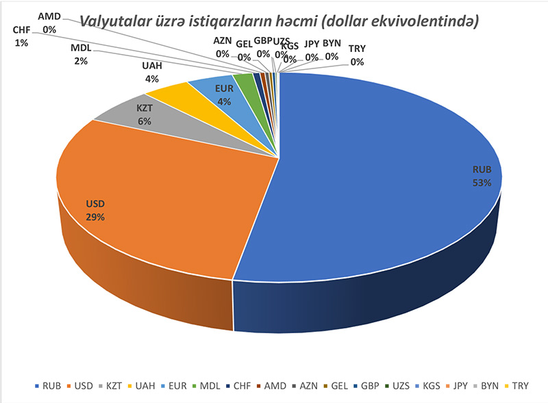 Aşağıdakı qrafikdə isə ümumi həcmi 735,9 milyard ABŞ dolları ekvivalentində olan istiqrazların həcmcə valyutalar arasında bölgüsü verilib. Görmək olur ki, bu region üzrə buraxılmış istiqrazların həcmcə 53% -i Rusiya rublunun, 29%-i ABŞ dollarının, 6% Qazaxstan təngəsinin, 4% Ukrayna qrivnasının, 4 faiz avro və digər valyutaların payına düşür.