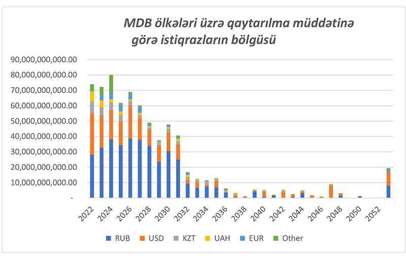 Aşağıdakı qrafikdə isə ümumi olaraq MDB-yə daxil olan ölkələrin buraxdığı istiqrazların qaytarılma müddətinə görə dollar ekvivalentində həcmi göstərilib.