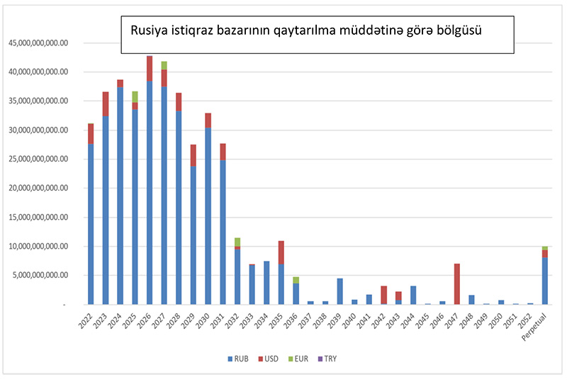 Qeyd edim ki, yuxarıdakı məlumatlar istiqraz bazarlarının böyük bir hissəsinin Rusiya dövlətinin payına düşdüyünü göstərir. Bunu qeyd etməkdə məqsəd ondan ibarətdir ki, hazırda Rusiyaya qarşı olan sanksiyalar müəyyən mənada digər ölkələr üçün də fəsadlar doğura bilər. Aşağıda Rusiyanın istiqraz bazarı təhlil olunub.