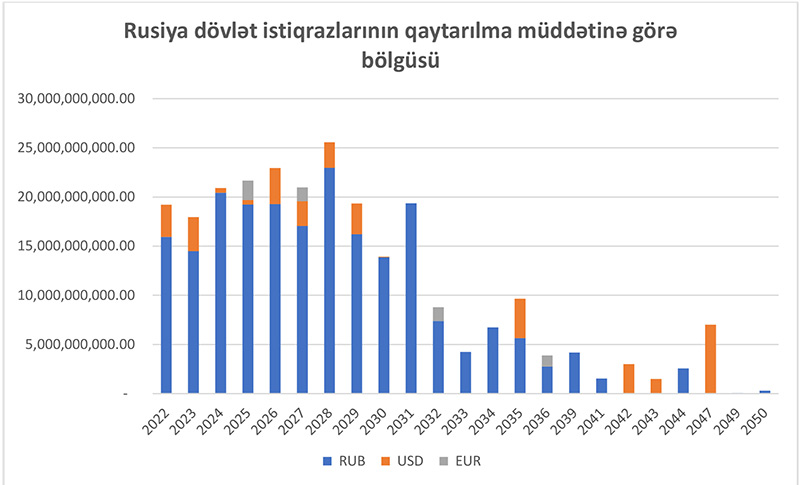Görmək olur ki, ümumi həcmin 384 milyard USD ekvivalentində rublda olan istiqrazların payına (88%), 47,4 milyard ABŞ dollarında olan istiqrazların (11%) yerdə qalan çox kiçik hissə isə avro və TRY payına düşür. Bir sözlə, dollarda olan borclanmanın düşünüləndən daha aşağı olduğu görsənir. Qeyd edim ki, bu bölgüdə bütün istiqrazlar həm dövlət, həm də korporativ istiqrazlar nəzərə alınıb. Aşağıda isə qaytarılma müddətinə görə həcmcə bu istiqrazların bölgüsü verilib.