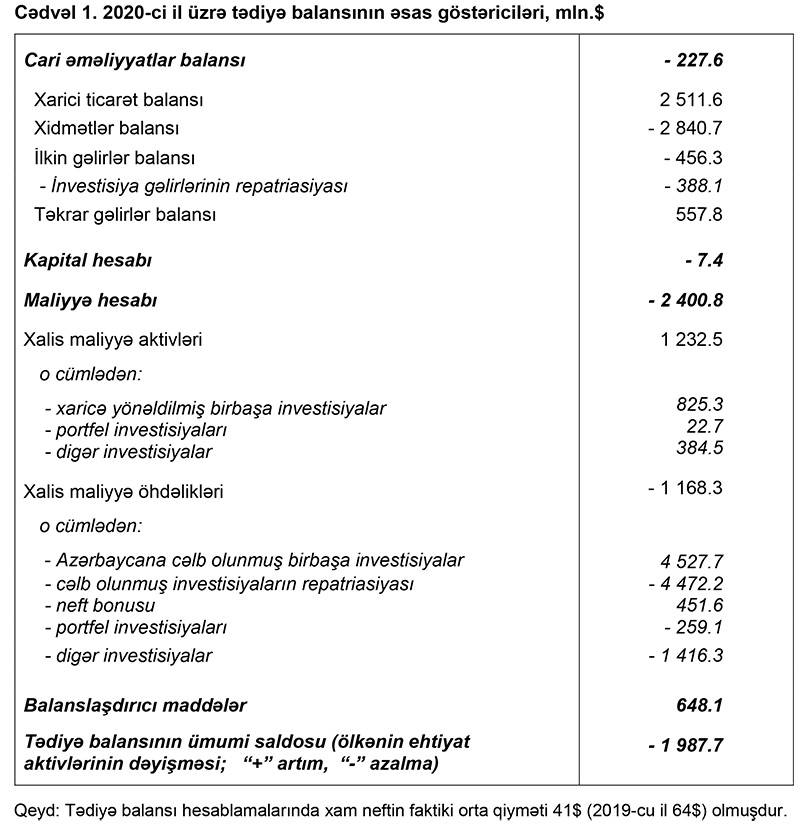 Marja xəbər verir ki, ötən il tədiyə balansının saldosu müsbət 3 milyard 81.4 milyon dollar təşkil edib. 2020-ci ildə tədiyə balansının saldosu mənfi 1 milyard 987.7 milyon dollar təşkil etmişdi.