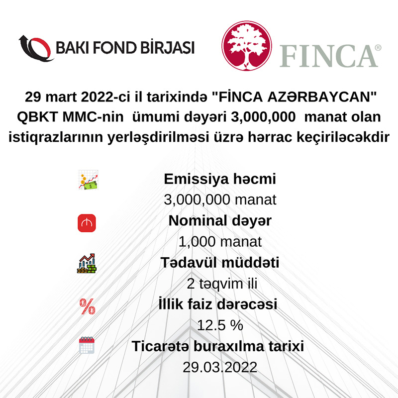 Birjadan Marja-ya daxil olmuş məlumata görə, 29 mart 2022-ci il tarixində "FİNCA AZƏRBAYCAN" QBKT MMC-nin istiqrazlarının yerləşdirilməsi Bakı Fond Birjasında birqiymətli hərrac üsulu ilə həyata keçiriləcəkdir.