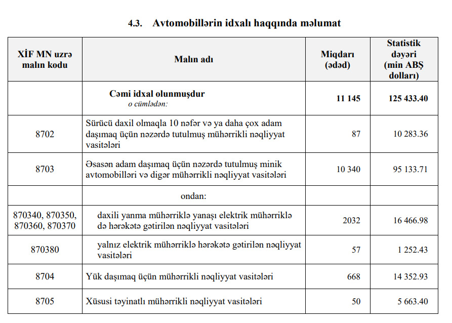 2022-ci ilin ilk 2 ayında Azərbaycanda 2 min 32 ədəd daxili yanma mühərriklə yanaşı elektrik mühərriklə də hərəkətə gətirilən nəqliyyat vasitələri və 57 ədəd yalnız elektrik mühərriklə hərəkətə gətirilən nəqliyyat vasitələri idxal edilib.