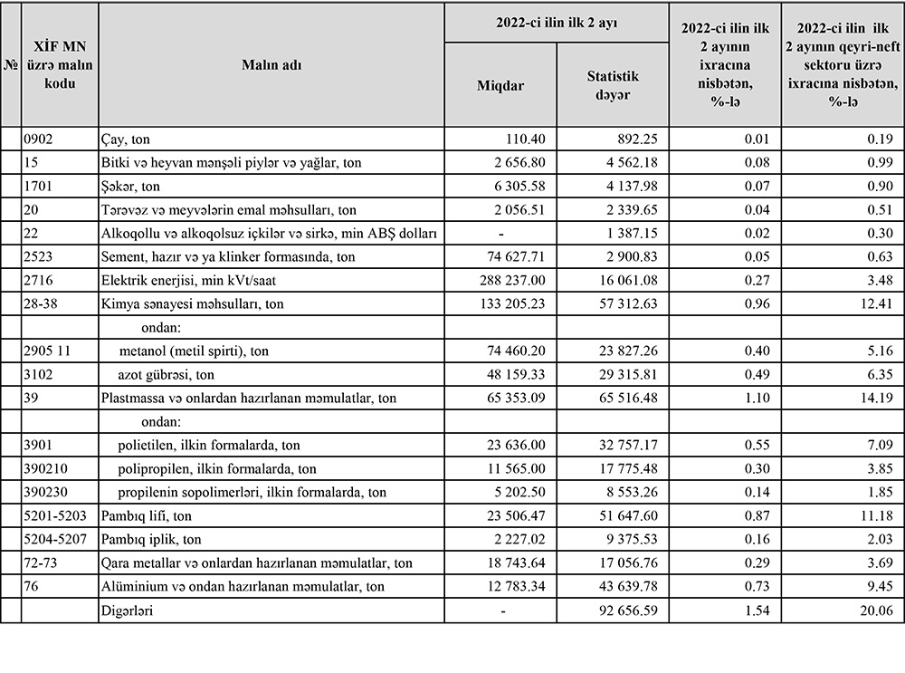 Azərbaycanın 2 ayda ixracı 6 milyard dollara yaxın olub.2022-ci ilin ilk 2 ayında Azərbaycanın xarici ticarət əməliyyatlarının həcmi 7 milyard 940 milyon 220 min ABŞ dolları təşkil edib.