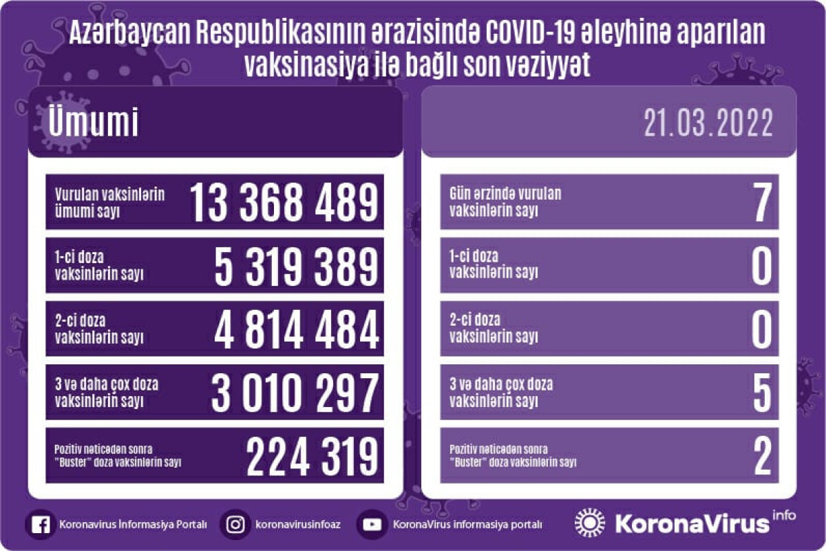 Azərbaycanda son sutkada koronavirus (COVID-19) əleyhinə 7 vaksin vurulub. Bir gündə birinci mərhələ üzrə vaksinasiya olunanların sayı 0, ikinci mərhələ üzrə vaksinasiya olunanların sayı 0, 3-cü və daha çox doza üzrə vaksinasiya olunanların sayı 5, pozitiv nəticədən sonra buster doza olunanların sayı isə 2 nəfərdir.