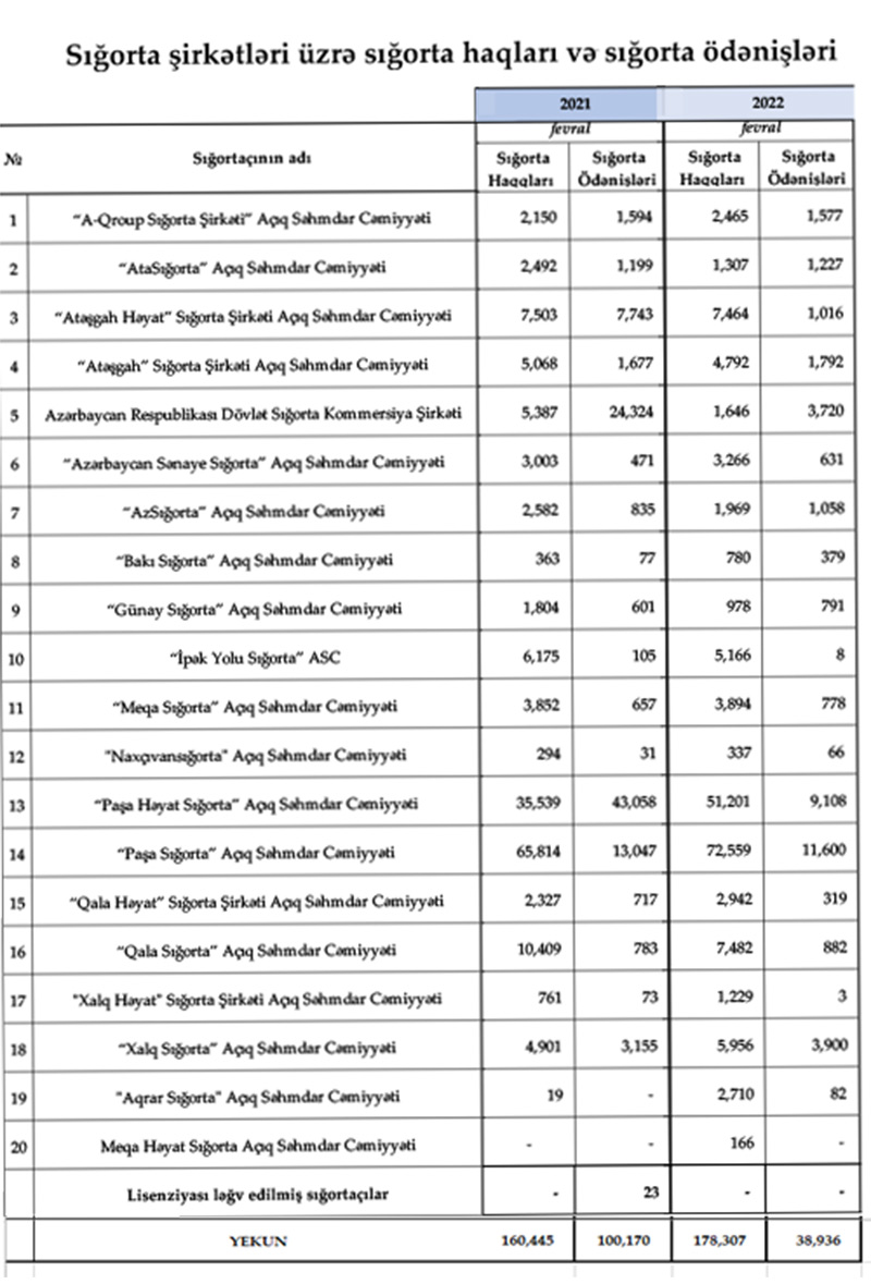 Şirkətlər üzrə sığorta haqları və sığorta ödənişləri - YANVAR-FEVRAL 2022
