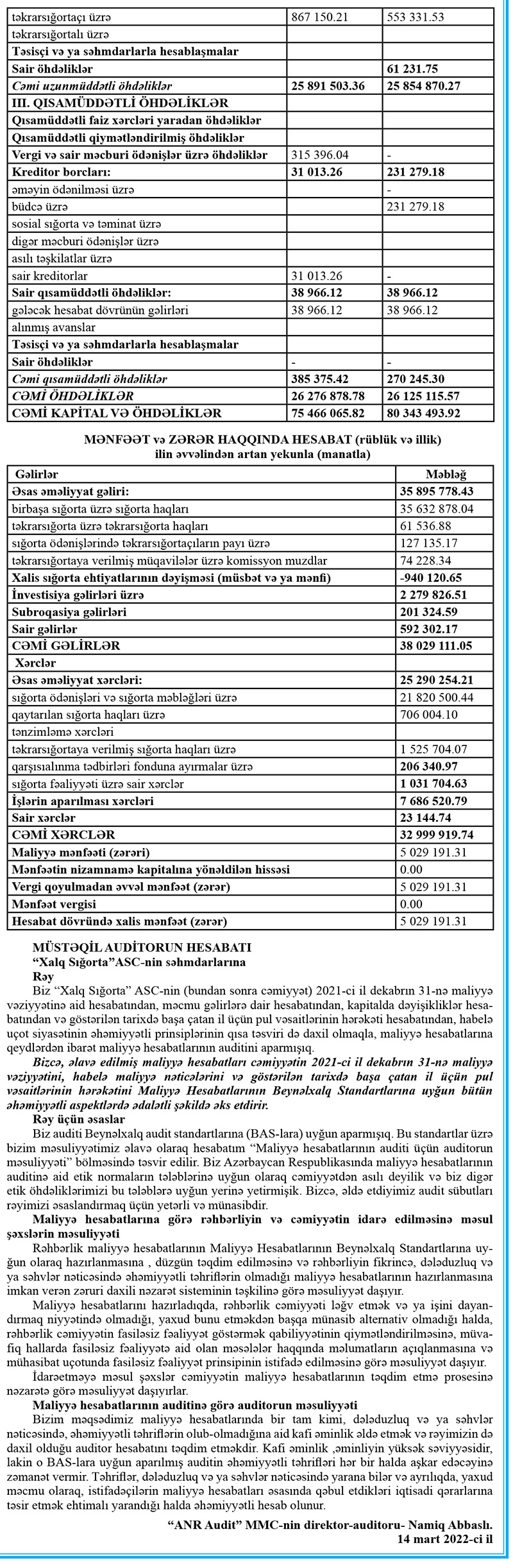 “Xalq Sığorta” ASC 2021-ci ili 5 milyon 29 min manat xalis mənfəət ilə başa vurub.