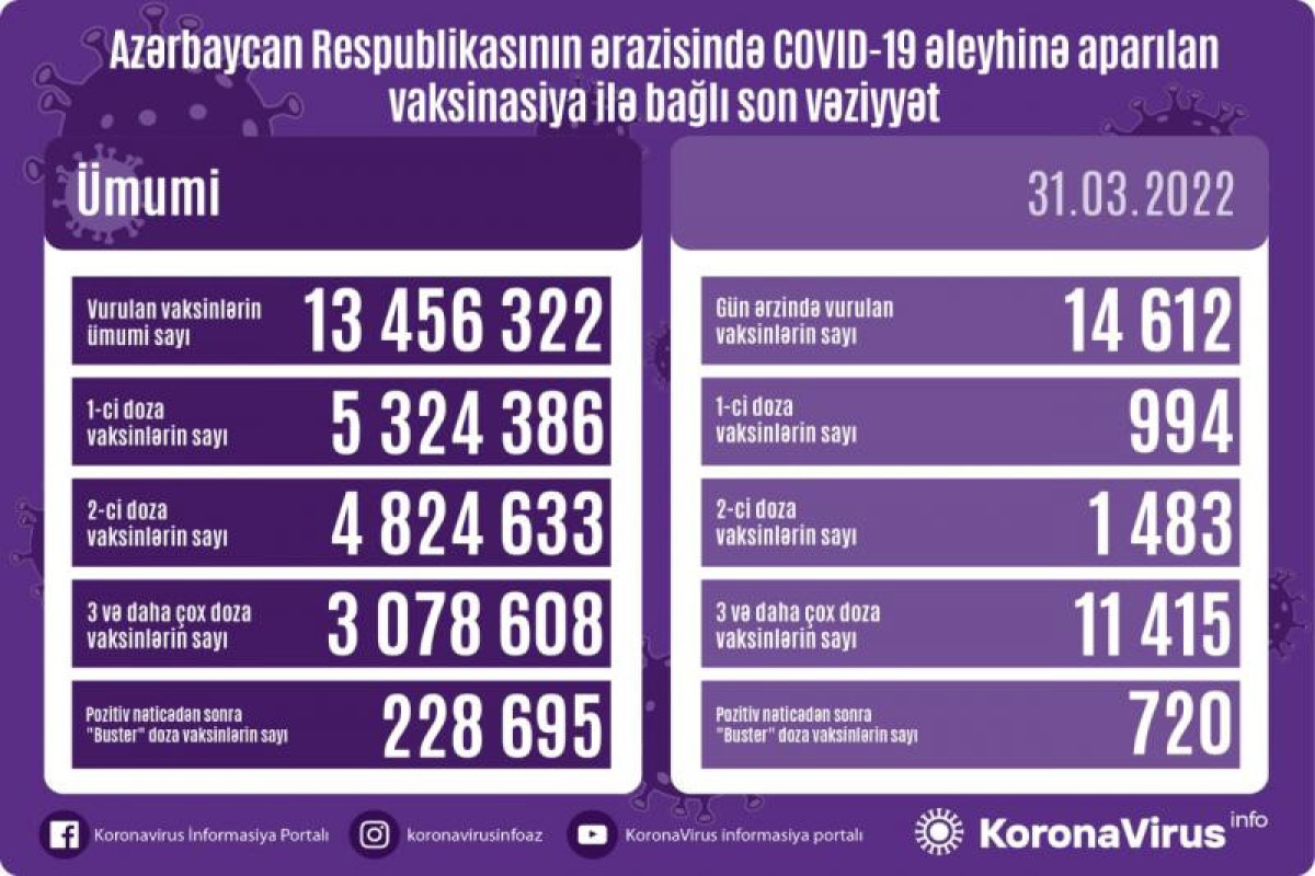 Azərbaycanda son sutkada koronavirus (COVID-19) əleyhinə 14 612 vaksin vurulub. Bir gündə birinci mərhələ üzrə vaksinasiya olunanların sayı 994, ikinci mərhələ üzrə vaksinasiya olunanların sayı 1 483, üç və daha çox doza vaksin vurduranların sayı 11 415, pozitiv nəticədən sonra buster doza üzrə vaksinasiya olunanların sayı isə 720 nəfərdir.