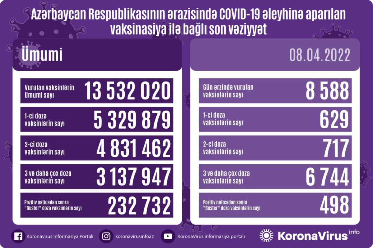 Azərbaycanda son sutkada koronavirus (COVID-19) əleyhinə 8 588 vaksin vurulub. Bir gündə birinci mərhələ üzrə vaksinasiya olunanların sayı 629, ikinci mərhələ üzrə vaksinasiya olunanların sayı 717, üç və daha çox doza vaksin vurduranların sayı 6 744, pozitiv nəticədən sonra buster doza üzrə vaksinasiya olunanların sayı isə 498 nəfərdir.