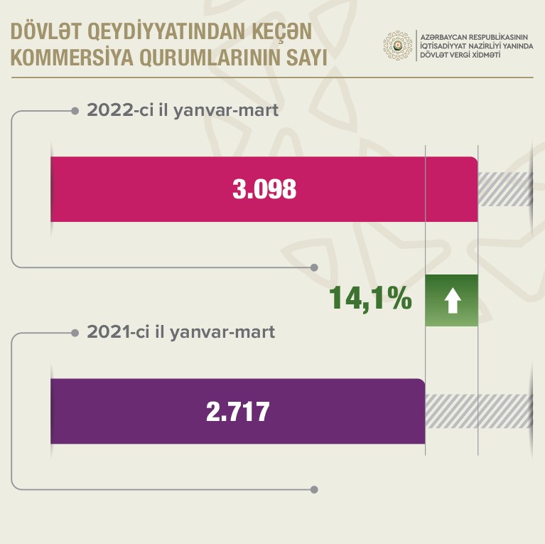 Yanvar-mart ayları ərzində 3 min 98 kommersiya qurumu dövlət qeydiyyatından keçib ki, bu da ötən ilin müvafiq dövrünə nisbətən 14,1% çoxdur. Kommersiya qurumlarının 82,2%-i elektron qaydada, 17,8%-i kağız daşıyıcılarda edilmiş müraciətlər əsasında qeydə alınıb. 530 kommersiya qurumunun (ümumi qeydiyyatın 17,1%-nin) ƏDV-nin məqsədləri üçün qeydiyyata alınması təmin edilib.