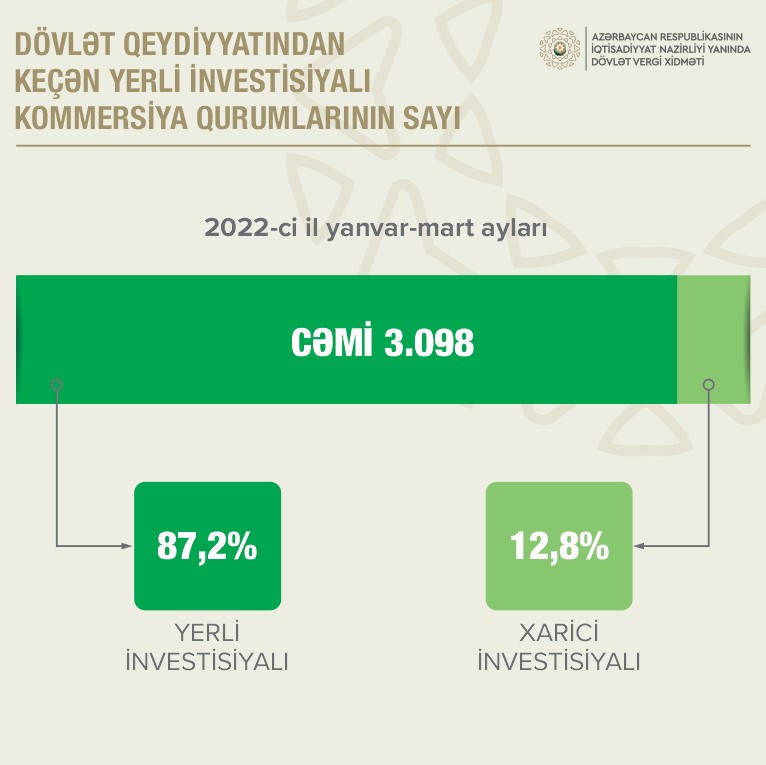 Hesabat dövründə qeydiyyatdan keçmiş kommersiya qurumlarının 87,2%-i yerli investisiyalı, 12,8%-i xarici investisiyalı müəssisələrdir. 2021-ci ilin müvafiq dövrü ilə müqayisədə yerli dövlət qeydiyyatına alınmış investisiyalı kommersiya hüquqi şəxslərin sayı 8,3% artıb. Ümumiyyətlə, aprelin 1-nə dövlət qeydiyyatında olan kommersiya hüquqi şəxslərin 88,9%-i məhdud məsuliyyətli cəmiyyət, 1,5%-i səhmdar cəmiyyət, 1,2%-i kooperativ və s. formalarda yaradılıb.