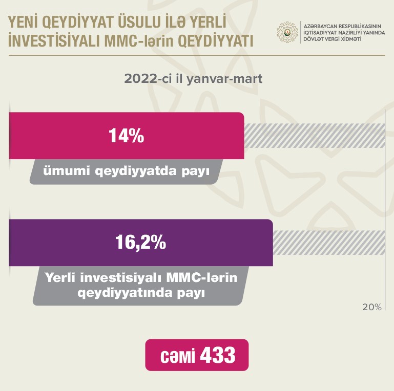 Birinci rüb ərzində fəaliyyəti aktivləşmiş (bərpa edilmiş) hüquqi şəxslərin sayı 2021-ci ilin müvafiq dövrü ilə müqayisədə 25,3%, fəaliyyəti aktivləşmiş ƏDV ödəyicilərinin sayı isə 20,2% artıb.