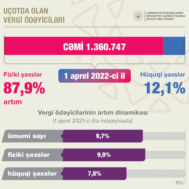 Yerli investisiyalı məhdud məsuliyyətli cəmiyyətlərin e-qeydiyyatının xüsusi çəkisi 95,1% təşkil edib2022-ci il aprelin 1-nə respublika üzrə uçotda olan 1 milyon 360 min 747 vergi ödəyicisinin 87,9%-i fiziki şəxslər, 12,1%-i hüquqi şəxslər və digər təşkilatlar olub.