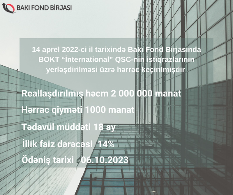 14 aprel 2022-ci il tarixində Bakı Fond Birjasında BOKT "İnternational" QSC-nin tədavül müddəti 18 (on səkkiz) təqvim ayı olan AZ2003021022 dövlət qeydiyyat nömrəli, 2 milyon manat həcmində, faizli, təmin edilməmiş sənədsiz, adlı istiqrazlarının yerləşdirilməsi üzrə hərrac yekunlaşmışdır.