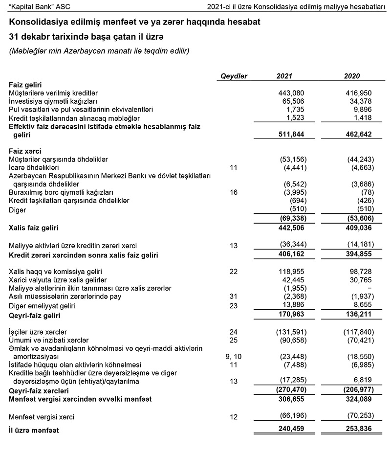 Marja hesabatlara xəbər verir ki, “Kapital Bank” 2021-ci ili 240 milyon 459 min manat xalis mənfəət ilə başa vurub. Bank 2020-ci ili 253 milyon 836 min manat xalis mənfəət ilə bağlamışdı.