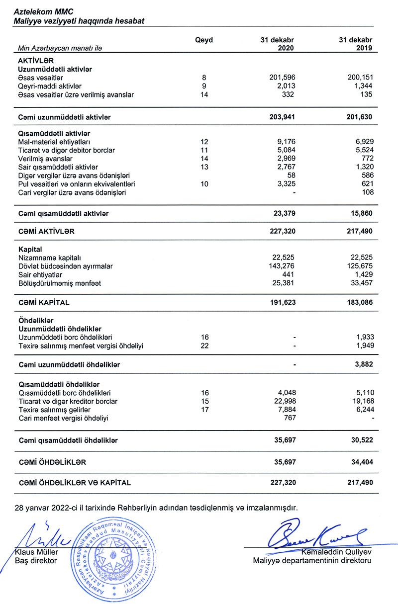 “Aztelekom” MMC-nin 2020-ci il audit edilmiş maliyyə hesabatlarının qısa icmalında bildirilir ki, Cəmiyyətin gəlirləri, əsasən, internet və telefon xidmətləri üzrə formalaşır və 2019-cu illə müqayisədə 2020-ci ilin gəliri 7,5% artaraq 90 milyon 677 min manata çatmışdır. Ümumi gəlirlərdə müşahidə edilən artıma baxmayaraq, Cəmiyyət 2020-ci ili 8 milyon 516 min manat zərərlə başa vurmuşdur. Zərərin formalaşmasına əsas səbəb əmək haqqı üzrə xərclərin və amortizasiya xərclərinin artması olmuşdur. Belə ki, işçilərin sosial rifahının yaxşılaşdırılması, həmçinin pandemiya ilə əlaqədar bəzi işçi heyətinin gücləndirilmiş iş rejiminə keçirilməsi əlavə ödənişlərin yaranmasına və müvafiq xərc maddəsinin müşahidə edilən ildə 14% artmasına gətirib çıxarmışdır. Zərərin formalaşmasına səbəb olan digər xərc maddələrindən amortizasiya xərcindəki artım Azərbaycan Respublikasının milli iqtisadiyyat perspektivi üzrə Starteji Yol Xəritəsinə uyğun olaraq iqtisadiyyatın rəqəmsallaşdırılması üçün İnformasiya Kommunikasiya Texnologiyaları infrastrukturunun təkmilləşdirilməsi istiqamətində Cəmiyyətin kapital qoyuluşları proqramını yerinə yetirməsi ilə əlaqədar olmuşdur. Belə ki, müvafiq proqram çərçivəsində tikintisi və quraşdırılması başa çatmış əsas vəsaitlər istismara verilmiş və bu da öz növbəsində əvvəlki telekommunikasiya sistemləri və avadanlıqların daha tez köhnəlməsinə gətirib çıxarmış, nəticədə amortizasiya xərci 29% artmışdır. Cəmiyyətin əməliyyat fəaliyyəti üzrə xalis pul vəsaitləri 2020-ci il üzrə 12 milyon 429 min manat təşkil etmişdir və bundan əlavə dövlət büdcəsindən regionlarda Universal Telekommunikasiya Xidmətlərinin təmin edilməsi ilə əlaqədar 17 601 min manat məbləğində vəsait ayrılmışdır. (Həmin məbləğ 2019-cu ildə 10 372 min manat olmuşdur). Ümumilikdə Cəmiyyətin 2020-ci ilin sonuna pul vəsaitlərinin vəziyyəti ötən illə müqayisədə xeyli yaxşılaşaraq 621 min manatdan 3 milyon 325 min manata qədər artmışdır.
