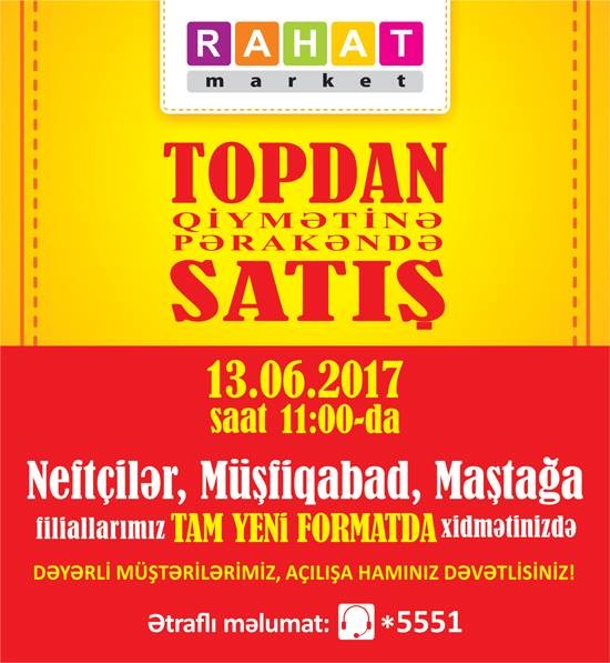"Əziz xalqımız, bildiyiniz kimi market şəbəkələri arasında ilk olaraq “RAHAT” market bir neçə filialını “Topdan” formatına keçirdi. Artıq bu filiallarda satılan bütün məhsulları siz topdan və hətta maya dəyərindən aşağı qiymətlərlə əldə edə bilərsiz. Bundan əlavə mütəmaddi olaraq həmin filiallarımızda çoxsaylı hədiyyəli aksiyalarımız da keçirilir. Bu qərarın müştərilərimiz arasında böyük rəğbətlə qarşılandığını görüb eyni yeniliyi davam etmək qərarına gəldik. Belə ki, 10.06.2017 – ci il tarixindən daha üç filialımızı – Binə, Biləcəri və Mehdiabad yeni “Topdan” formatında açdıq. Bu son deyil, bizi izləyin. Bizi seçdiyiniz üçün sizə minnətdarıq",- "Rahat" şəbəkəsinin yaydığı məlumatda deyilir.