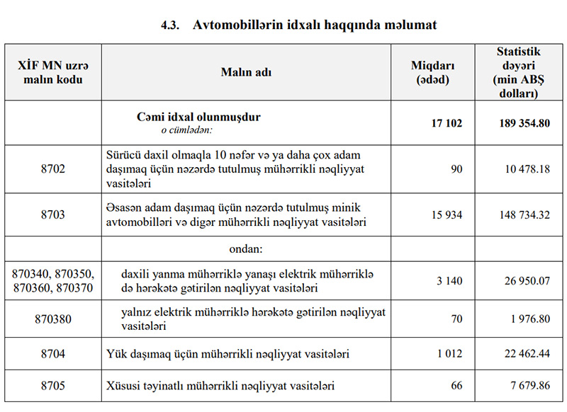 2022-ci ilin ilk 3 ayında (1-ci rübdə) Azərbaycana 189 milyon 355 min dollar dəyərində 17 min 102 ədəd nəqliyyat vasitəsi (avtomobi) idxal edilib.