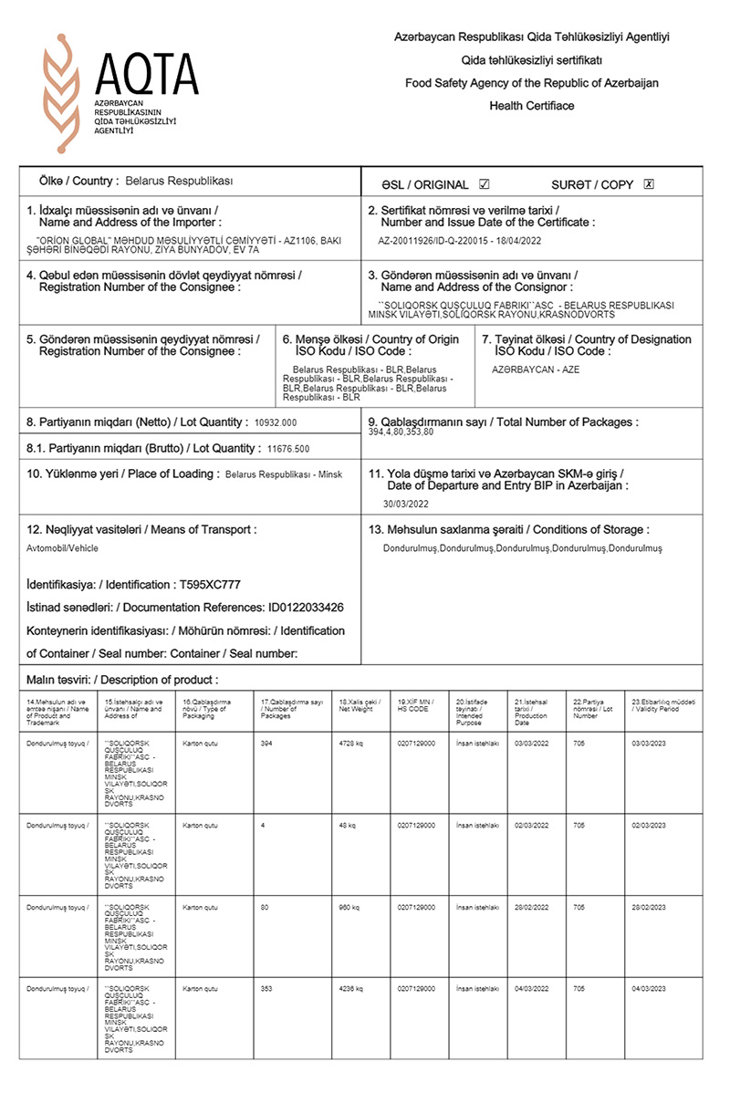 Məlumat üçün qeyd edək ki, xəbər mətnində sözügedən “Bütöv kənd toyuğu” məhsullarını “Bazarstore” MMC birbaşa özü idxal etmir, müvafiq mülki-hüquqi müqavilə əsasında digər bir şirkətdən satın alır. Həmin şirkət tərəfindən bizə təqdim edilmiş sənədlərə (məhsulların istehsal olunduğu ölkədə istehsal sertifikatı, AQTA sertifikatı, istehsal olunduğu ölkədə qüvvədə olan müvafiq standartlar) əsasən qeyd etməliyik ki, adı çəkilən məhsullar “Qaraqaşlı Broyler”in təmsilçisi V.Hüseynovun iddia etdiyi kimi “broyler” toyuğu deyil, məhz “kənd” toyuğudur. Üstəlik məhsulların idxalına AQTA tərəfindən icazə verilmişdir. Bu o deməkdir ki, həmin məhsulların tərkibində hər hansı təhlükəli maddə və ya xəstəlik riski olmayıb. Təmsilçinin digər bir iddiasına cavab olaraq bildiririk ki, məhsulların son istifadə tarixləri saxlama temperaturundan asılı olaraq, -12 C dərəcədə 8 ay, -18 C dərəcədə 12 ay, -25 C dərəcədə isə 14 aydır”.