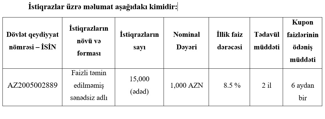 Birjadan Marja-ya daxil olmuş məlumata görə, faizli təmin edilməmiş sənədsiz adlı istiqrazların sayı 15 min ədəd, hər birinin nominal dəyəri 1000 manat, illik faiz dərəcəsi 8,5%, tədavül müddəti 2 il, kupon faizlərinin ödəniş müddəti 6 aydan birdir.