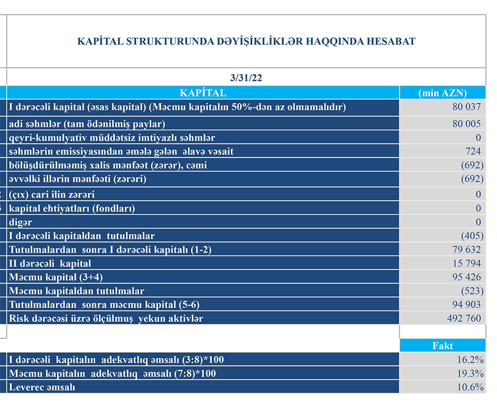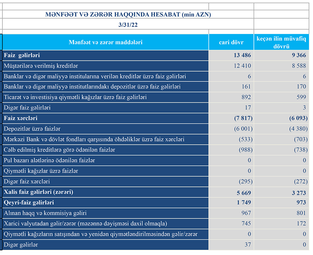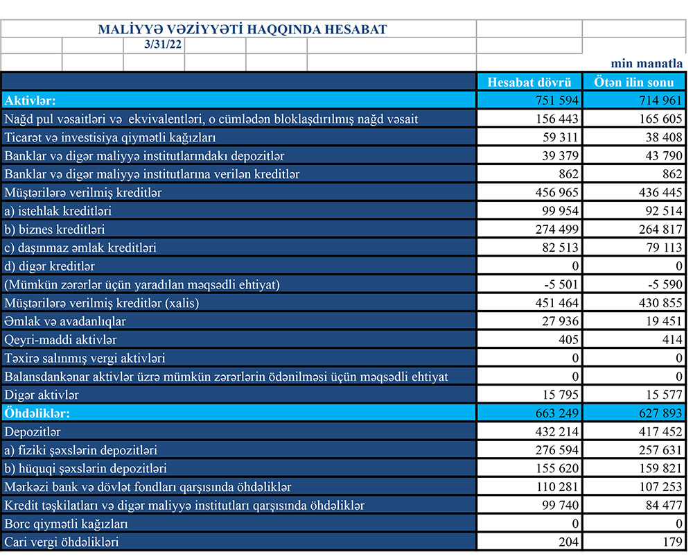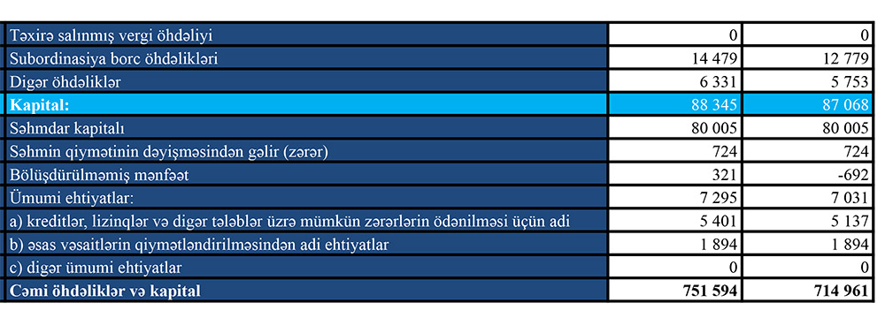 Bankın cəmi aktivləri isə 36 milyon 633 min manat və ya 5,1% aratraq 751 milyon 594 min manata çatıb.