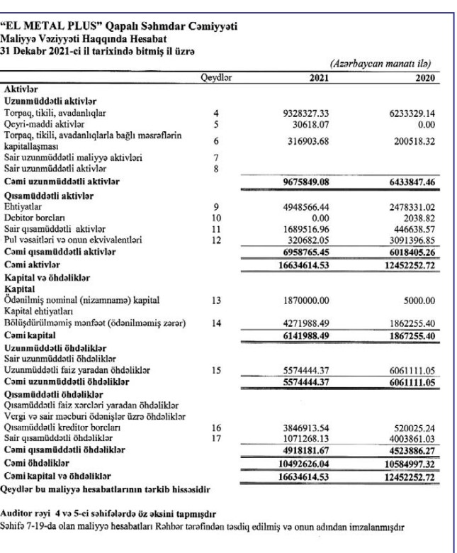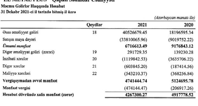 Armatur istehsalı ilə məşğul olan "El Metal Plus" şirkəti 2021-ci ili 4 milyon 267 min manat xalis mənfəət ilə başa vurb. Halbuki, şirkət 2020-ci ili 4 milyon 918 min manat xalis mənfəət ilə bağlamışdı.