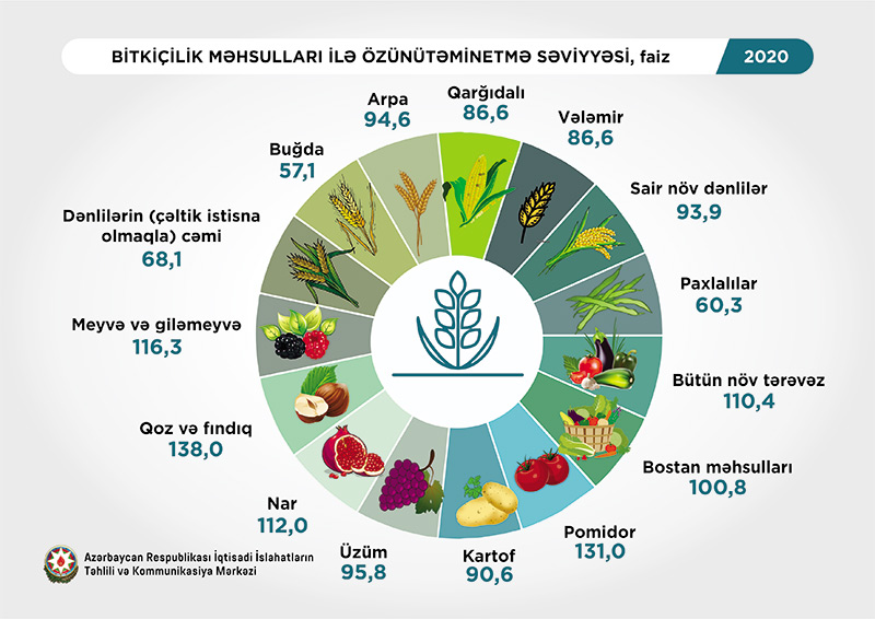 İqtisadi İslahatların Təhlili və Kommunikasiya Mərkəzi Azərbaycanın bitkiçilik, heyvandarlıq və sənaye emalından keçmiş əsas növ ərzaq məhsulları ilə özünütəminetmə səviyyəsini araşdırıb.