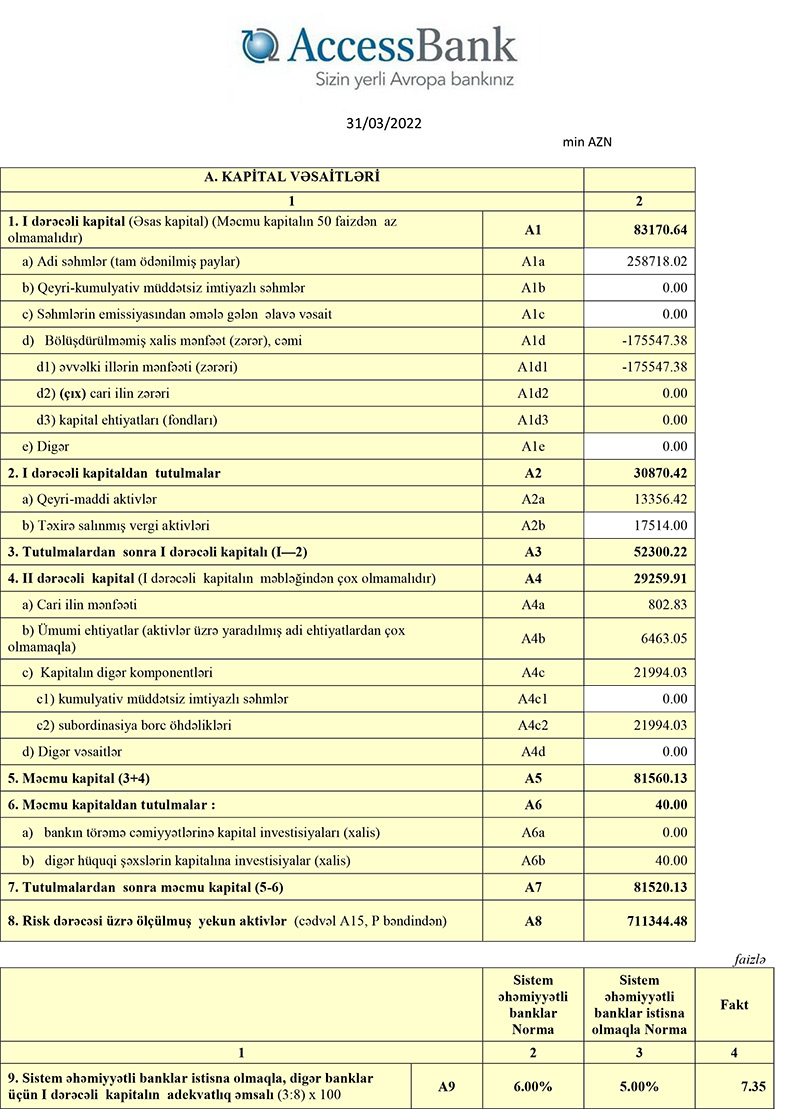 Hazırda Bankın cəmi məcmu kapitalı 81.5 milyon manat təşkil edir ki, bu da minimum məcmu kapital normasından (50 milyon manat) 31.5 milyon manat çoxdur.