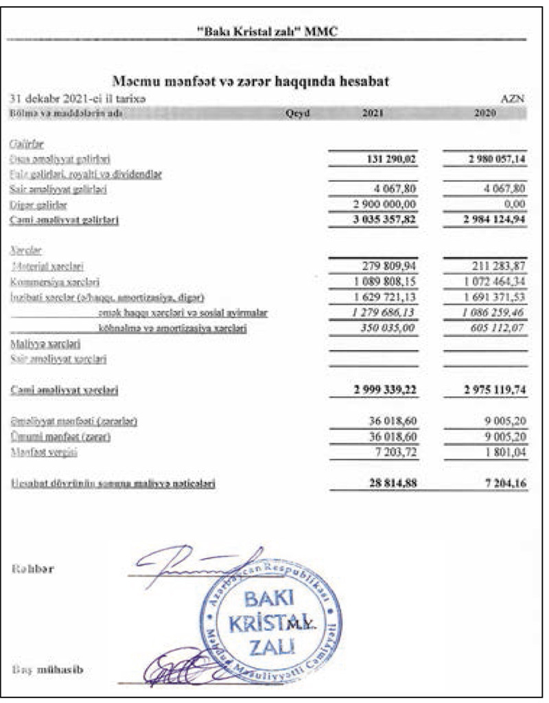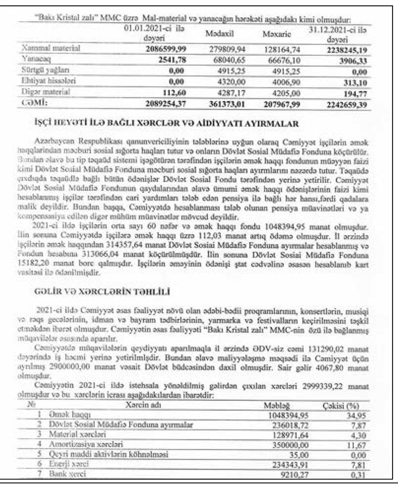2021-ci ildə "Bakı Kristal Zalı"nın cəmi əməliyyat xərcləri 2 milyon 999 min manat təşkil edib. Ötən il şirkət 36 min 18 manat əməliyyat mənfəətindən 7 min 204 manat mənfəət vergisi də ödəyib.