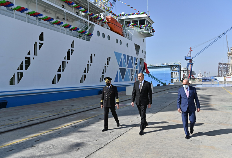 Gəmi-bərə ilə tanış olan Prezident İlham Əliyev daha sonra onun işə salınmasını bildirən düyməni basıb.
